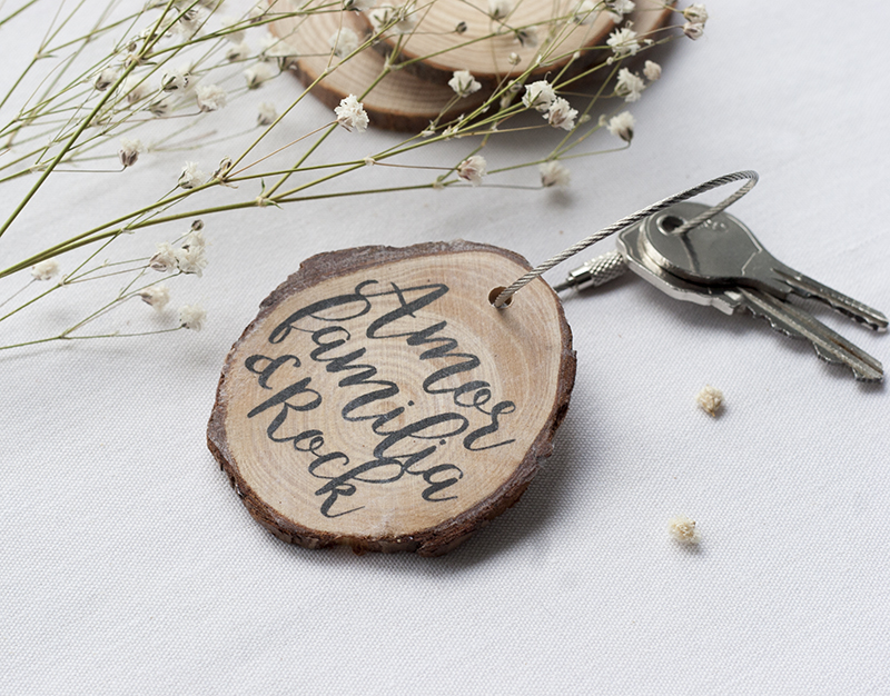 Y este es el resultado... Así nos han quedado os casi 60 llaveros con rodajas de madera que hemos hecho ¿Os gusta cómo queda? ¿Y qué nos decís de la frase que hemos elegido?