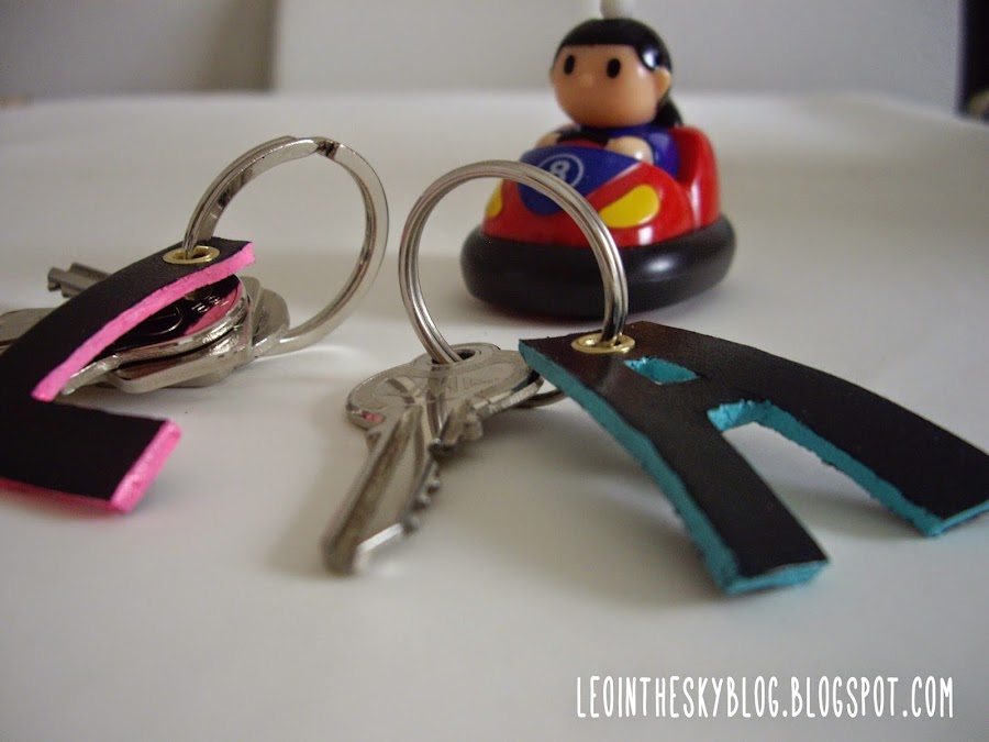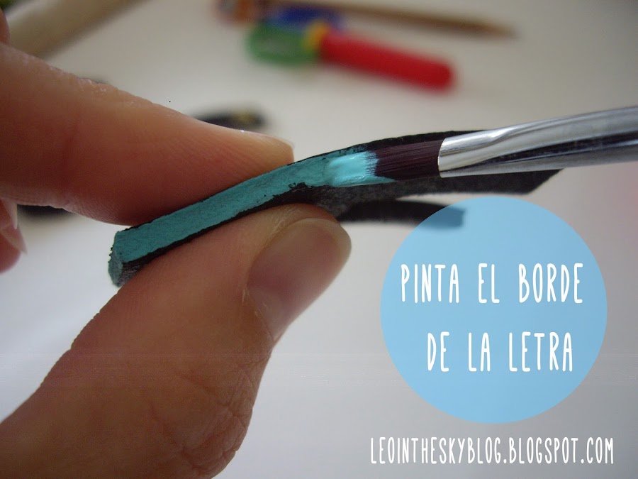Si ponemos la anilla-llavero ya podría estar terminado..., pero a mí siempre me gusta dar un toque de color :) así que se me ocurrió pintar los bordes de las letras con pintura acrílica. Una vez seca, le dí una capa de barniz transparente mate para protegerla.