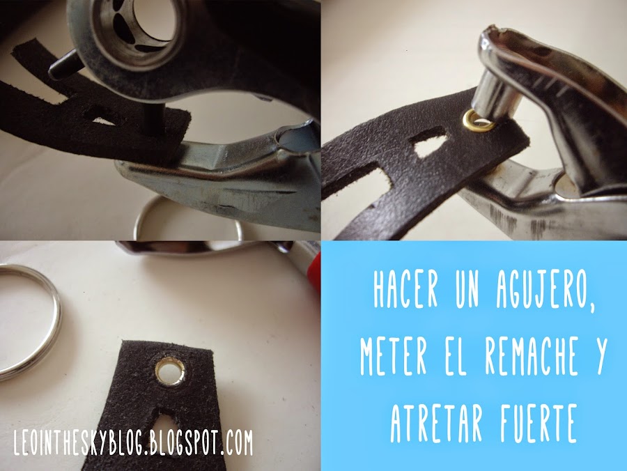 Hacemos el agujero por el que meteremos la anilla-llavero, introducimos el remache y apretamos con fuerza con la remachadora.