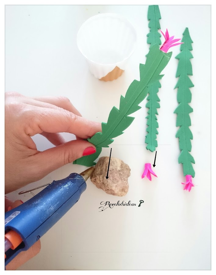 Con la pistola de silicona caliente pegar las flores a las hojas y las hojas sobre una piedra en la disposición que mas nos guste, luego introducir en la maceta.