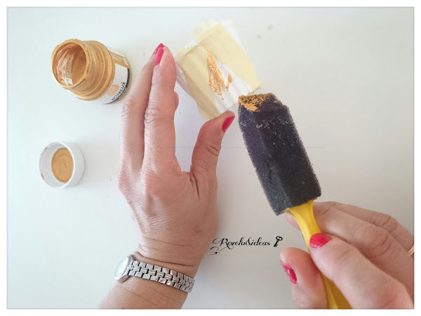 Pintar con pintura dorada las macetitas de los envases de quesos frescos, a la cual se le recorta todo el reborde que llevan alrededor, utilizando la cinta de carrocero haremos el dibujo que queramos, para delimitar la zona, en este caso hice un triángulo en el centro, pero se pueden hacer mil y una combinaciones.