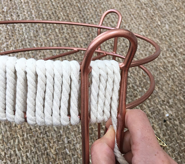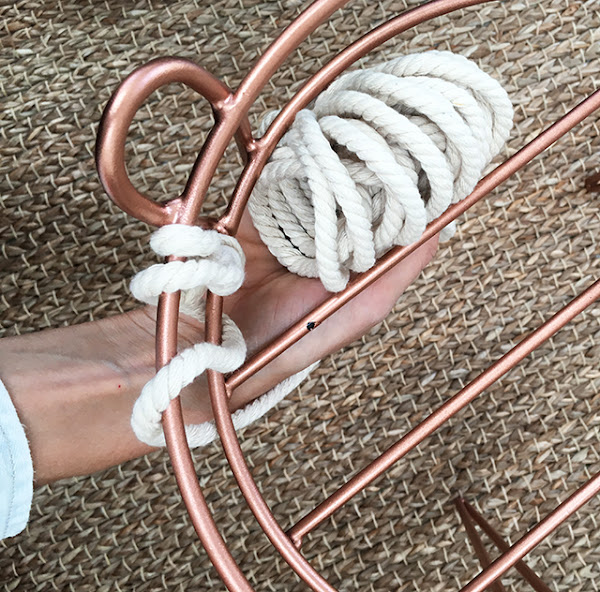 El paso a paso es muy muy sencillo pero requiere algo de paciencia. Después de pintar los maceteros con spray (en este caso de color cobre) hay que poner la cuerda para crear la base donde irá colocada la maceta. Y aquí es donde viene la parte más "complicada", pero tal y como aparece en la foto el truco está en ir colocandola muy pegada y bien sujeta.