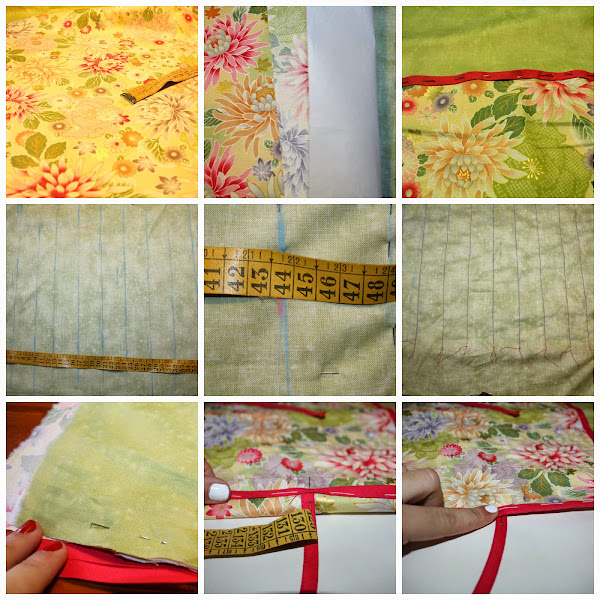 4. ponemos la entretela entre verde y la de flores y afianzamos como alfileres, hilvanamos y cosemos.