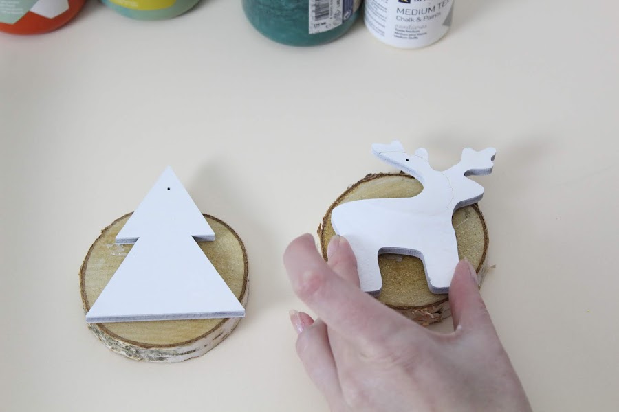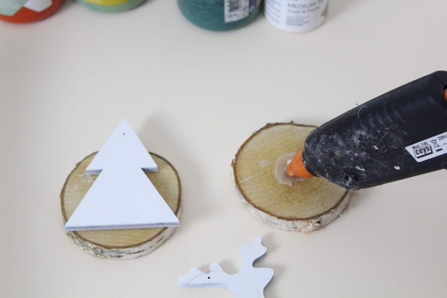 1 Paso: Preparar los sellos que nos servirán para hacer la cenefa, pegaremos los adornos navideños de madera en soportes redondos. Podéis escoger decoraciones en fieltro, también irían bien.