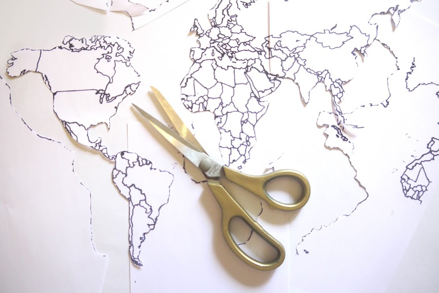 Lo primero que hay que hacer es recortar las plantillas. No hace falta que seamos muy precisos porque si no nos llevará mucho tiempo. Con que se identifiquen los continentes es suficiente. Te recomiendo que hagas los bordes un poco redondeado, que las puntas muy agudas no se hacen bien del todo sobre corcho.