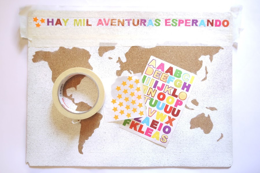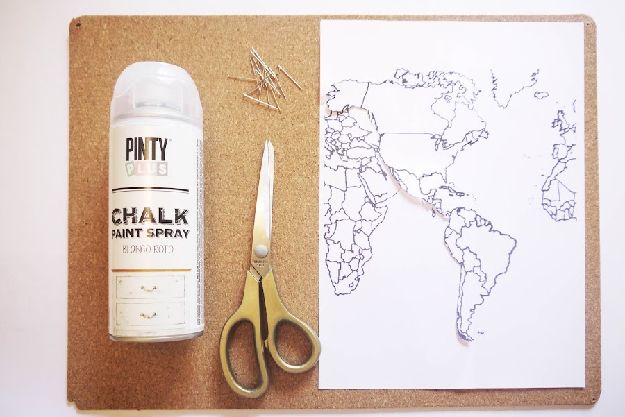 Lo que hace falta es: un corcho (el mío es de ikea), spray del color que queramos el fondo, alfileres, tijeras y una plantilla del mundo. También he utilizado pegatinas de letras, cinta de carrocero y un spray de otro color para poner el título.