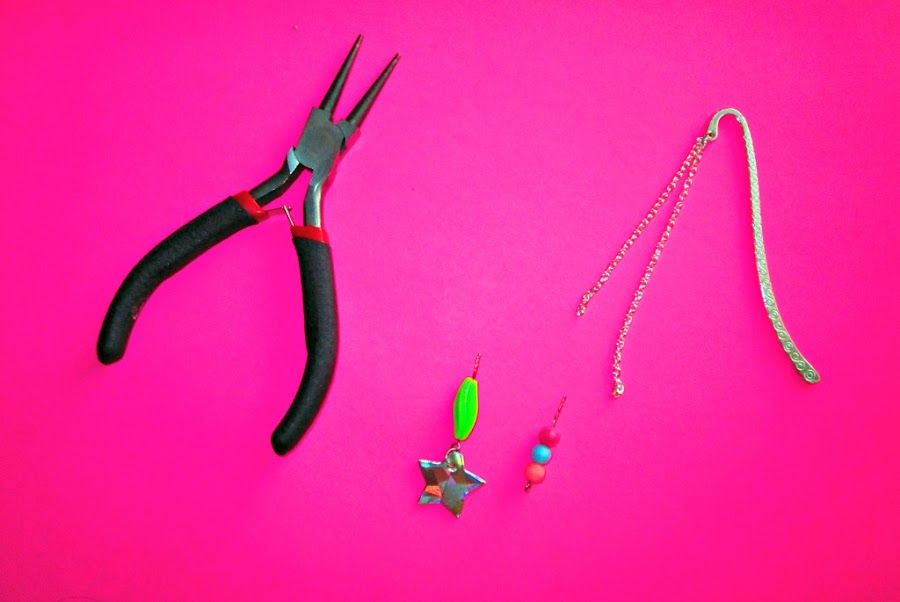 Primero, cortamos la cadena a la medida deseada, y después le enganchamos una anilla. Después lo enganchamos al marcapáginas.