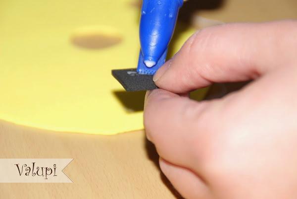 Ponemos todas las piezas en su lugar y verificamos que encajen. Es en este momento cuando podemos rectificar las partes que nos han podido quedar más grandes y retocarlas. Os aconsejamos hacer los agujeros de los ojos en el color amarillo un poco más grandes para que encaje mejor la parte blanca.