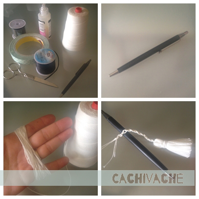 Con hilo blanco preparé un colgante y con hilo de cola de ratón envolví el boli.