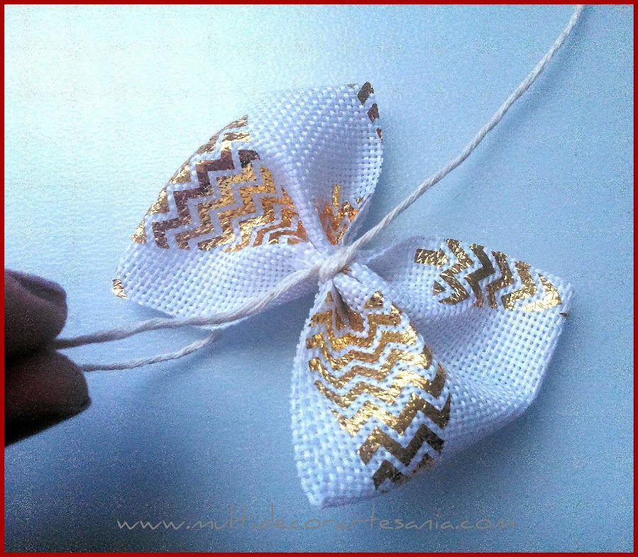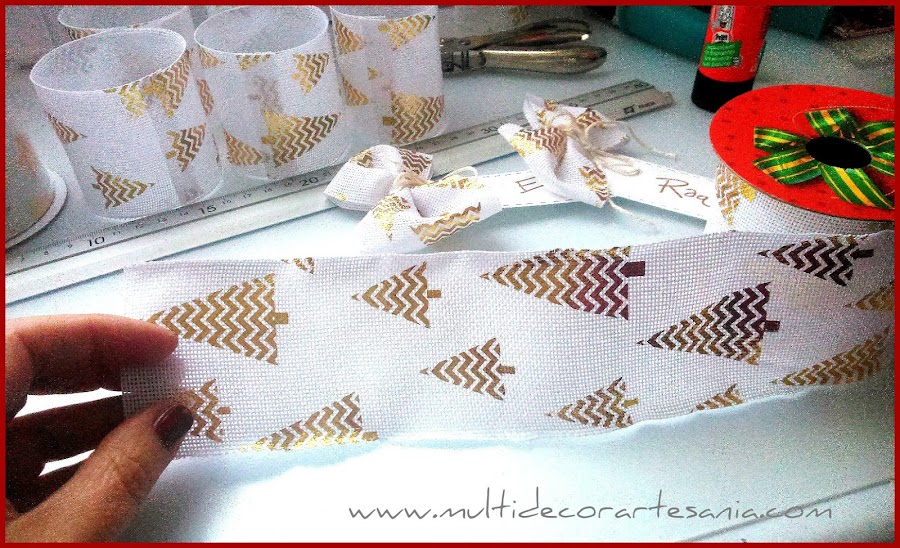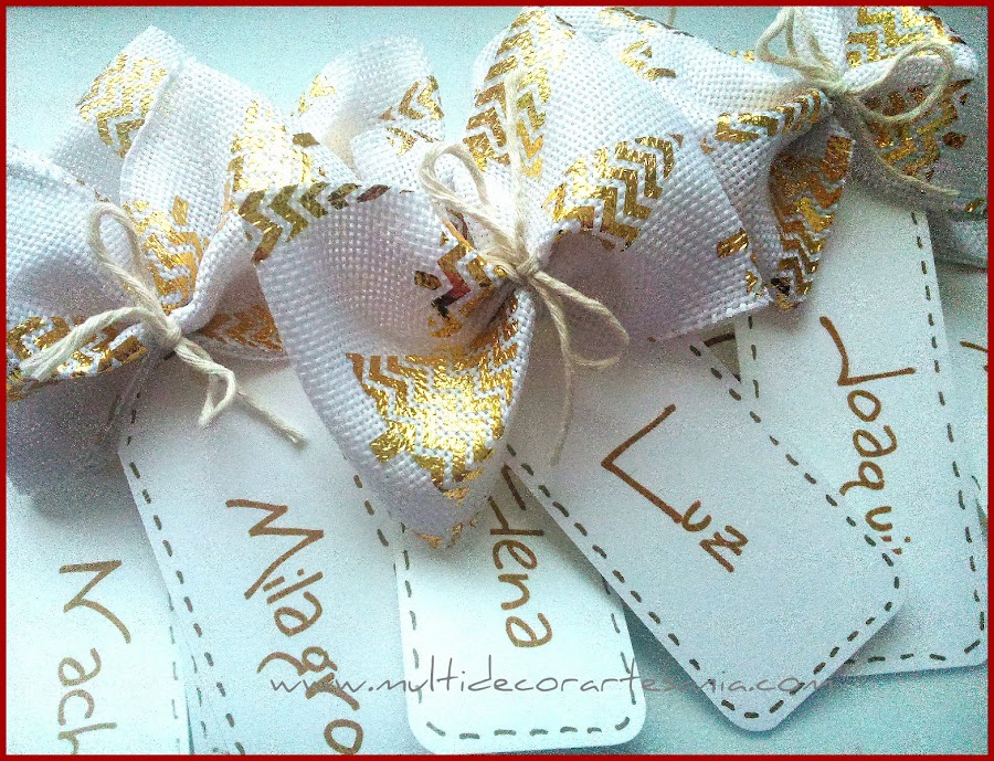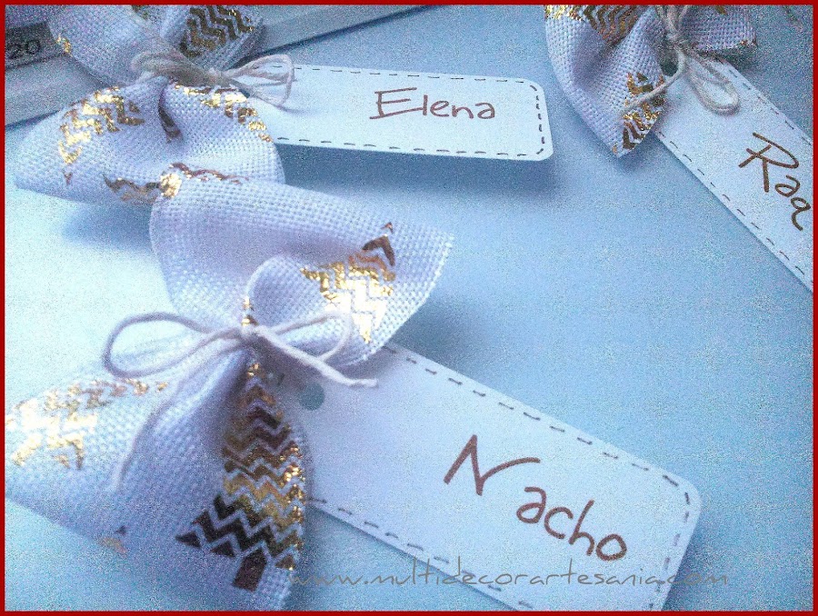 Para hacerlo he utilizado una cinta chulísima en blanco con árboles dorados, cordel y las etiquetas con los nombre.