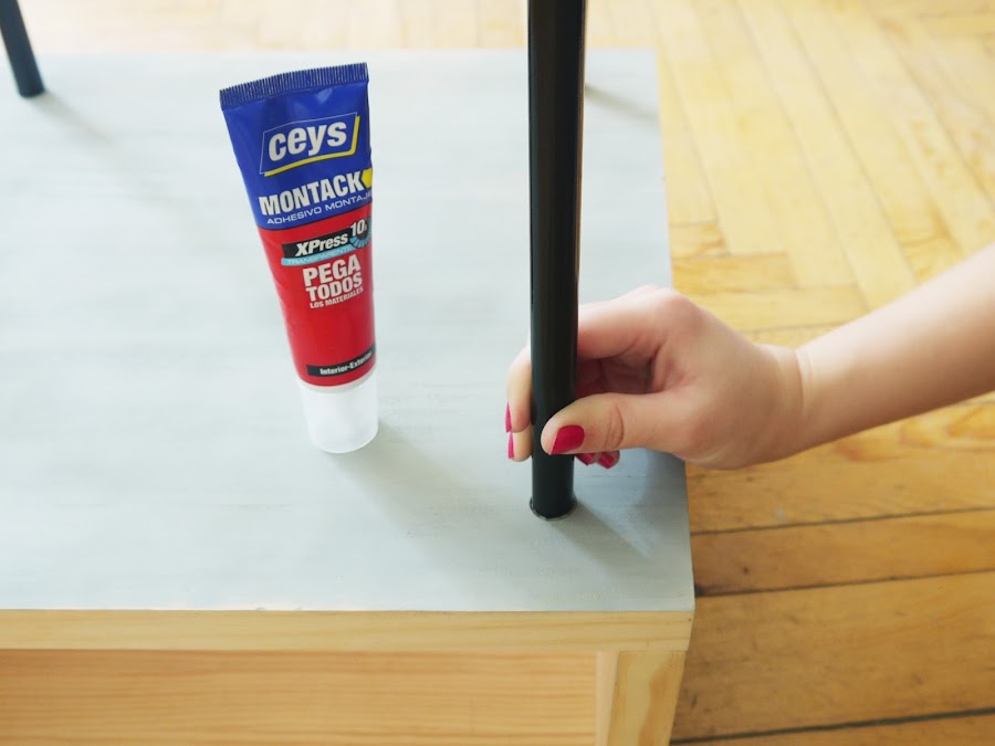7. Por último, utiliza el pegamento Montack transparente para pegar las patas a la mesa.