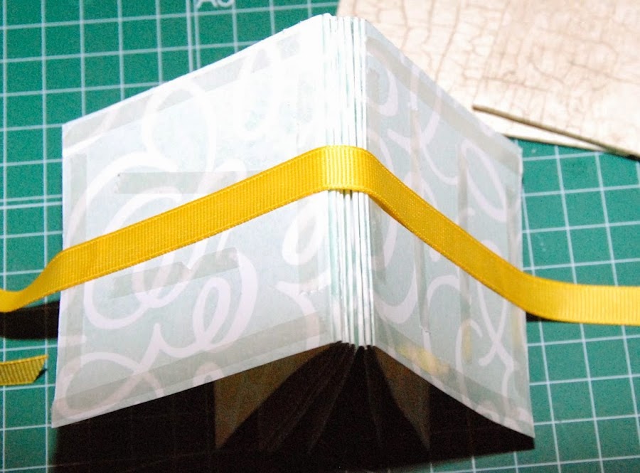 5º En las dos hojas que habíamos separado antes, ponemos cinta de doble cara y ponemos nuestra cinta, que va a servir de cierre de nuestro mini.