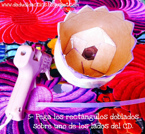 Con los pliegues rectangulares ya doblados, aplícales el pegamento caliente y pégalos sobre el lado más brillante del CD y ya tendrás armada la coronita.