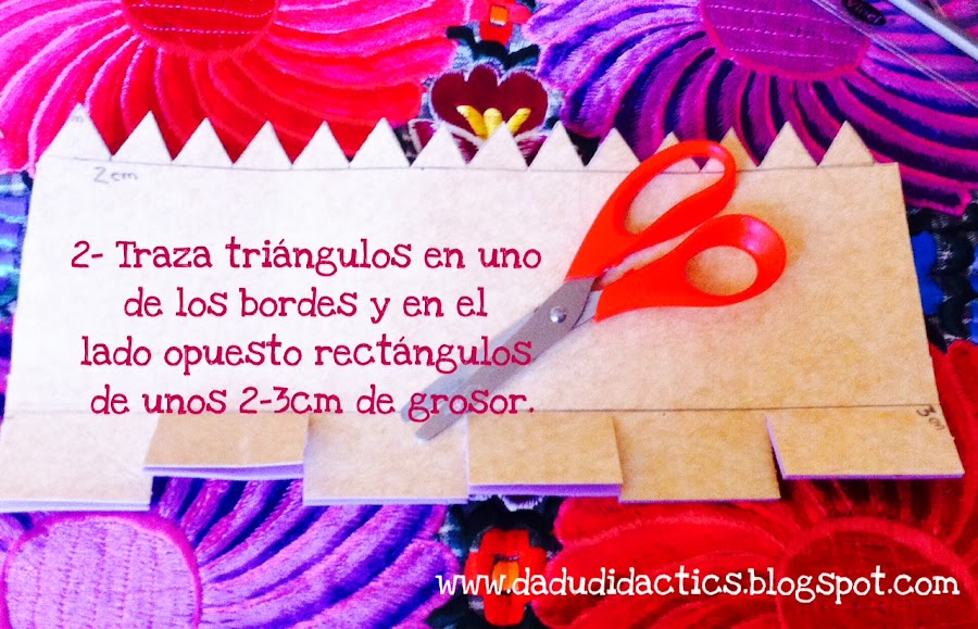 Traza con ayuda del lápiz y la regla, sobre los lados que miden 28cm unos triángulos para simular los picos de una coronita y en la parte de abajo, realiza cortes rectangulares. Los triángulos son equiláteros y miden 2cm y los rectángulos miden 3x4cm.