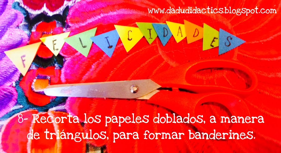 Una vez que terminamos de elaborar nuestro mensaje con los sellos, ahora los recortaremos en forma de banderines triangulares.