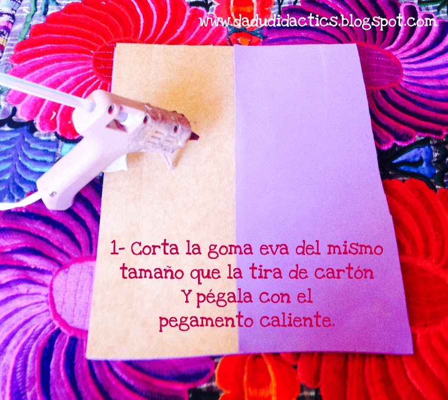 Primeramente deberás cortar el cartón y la goma eva de la misma medida 28x12cm cada uno y unirlos con el pegamento de silicón caliente.