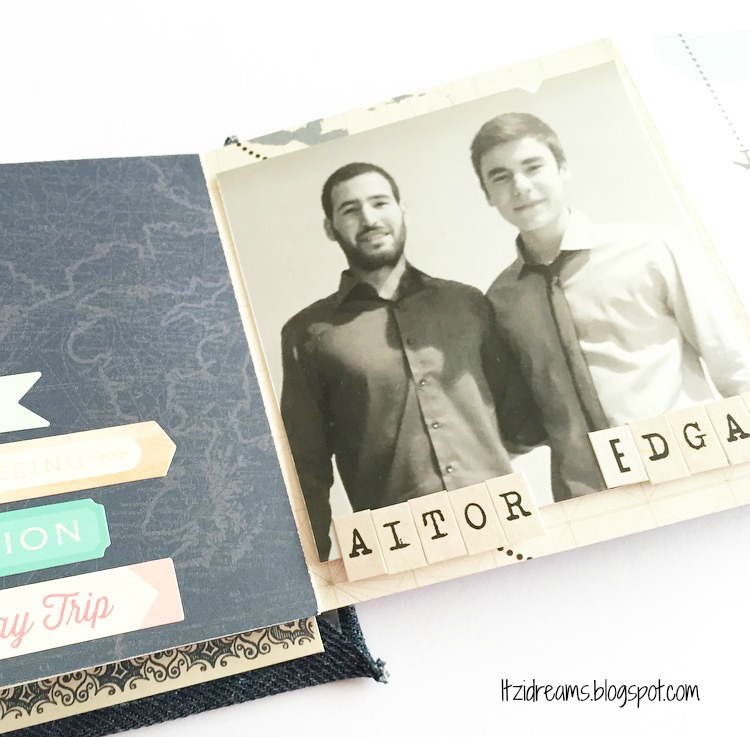 Tercero, pegamos las fotografías, dejando los extremos vacíos y espacios en blanco para escribir alguna frase, recuerdo o palabras que queramos dedicarle. Complementamos el diseño con chapas, enamel dots, stockers, etc...
