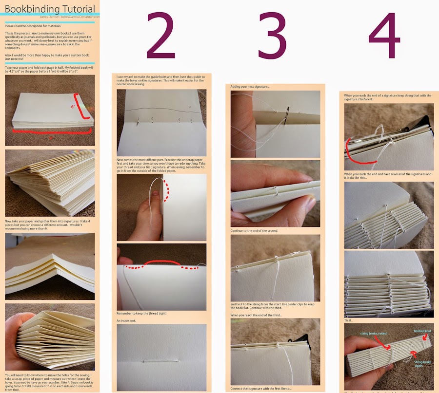 Este es el tutorial de encuadernación de James Darrow que había mencionado y en el que me basé para hacer mi librito (aunque reconozco que no lo seguí tal cual) Os dejo la foto de los pasos que más o menos seguí yo (si pincháis en el enlace podéis ver el tutorial original completo y más grande)