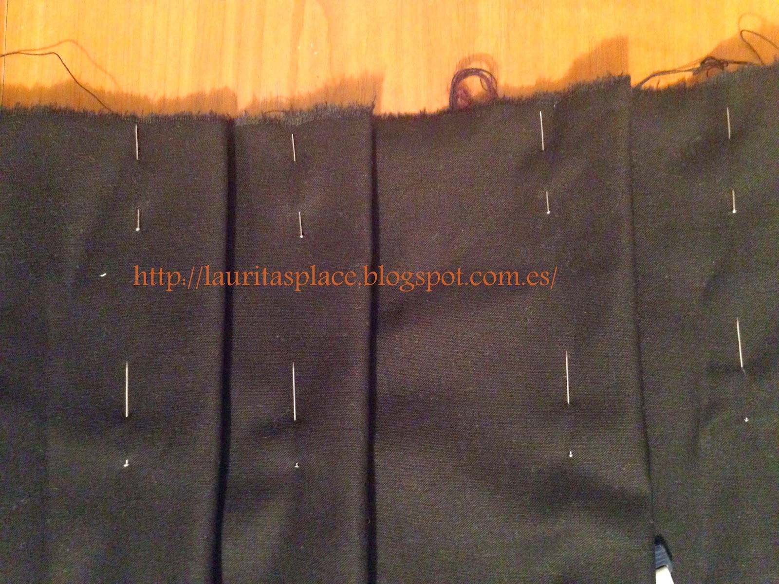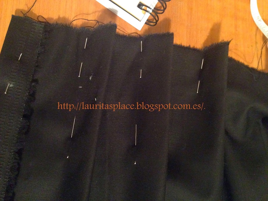 Cada tabla lleva 5 cm. de tela. He dejado en el centro una pieza de 14 cm. y el los laterales una pieza a cada lado de 8 cm. sin tablas para que no me coincidiesen las tablas ni en el frente ni en los laterales.