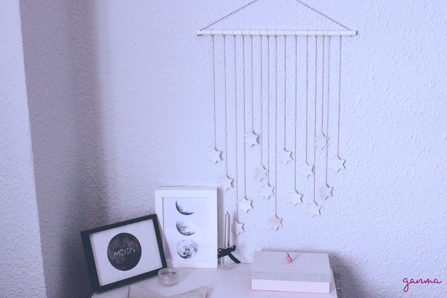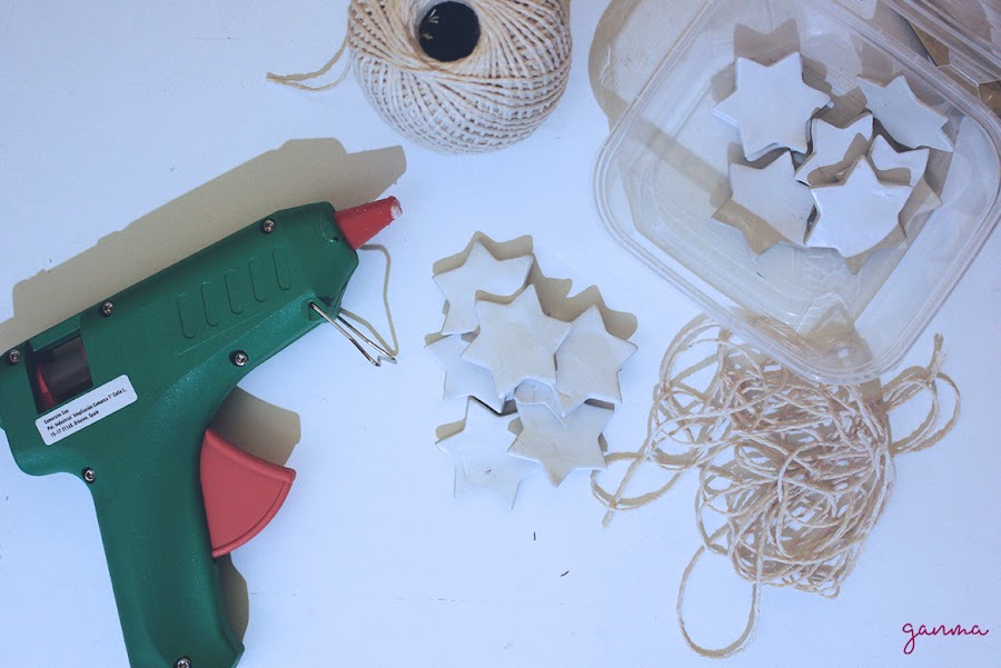 Con todo seso pasamos a cortar pedacitos de cuerda para colgar las estrellas. Con la pistola de pegamento pegamos una punta a la estrella y la otra la atamos a la cuerda. A mi me gusta que cada estrella quede a una altura distinta pero puedes colocarlas como mas te guste.
