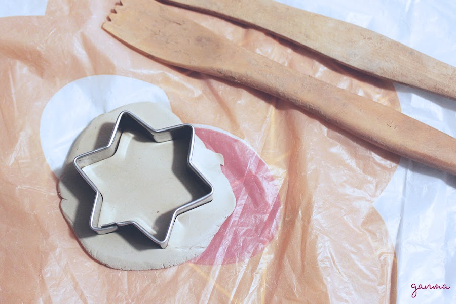Cogemos un pedazo de arcilla y lo aplanamos con ayuda de un rodillo. Al igual que para hacer galletas unas vez la arcilla plana con el cortador vamos sacando estrellitas. Puedes hacerle un agujerito en una de las puntas o dejarlas tal cual (yo hice lo segundo). Dejamos secar las figuras cortadas unos días y una vez secas las pintamos con spray (si las pintas por los dos lados mucho mejor).