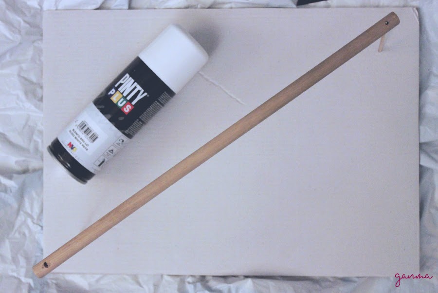 En el palo que escojamos para crear nuestro móvil le hacemos unos agujeritos en los extremos para mas adelante poder pasar una cuerda. Ya que tenemos el spray en la mano aprovechamos para pintar también el palo y dejarlo todo bien blanquito.