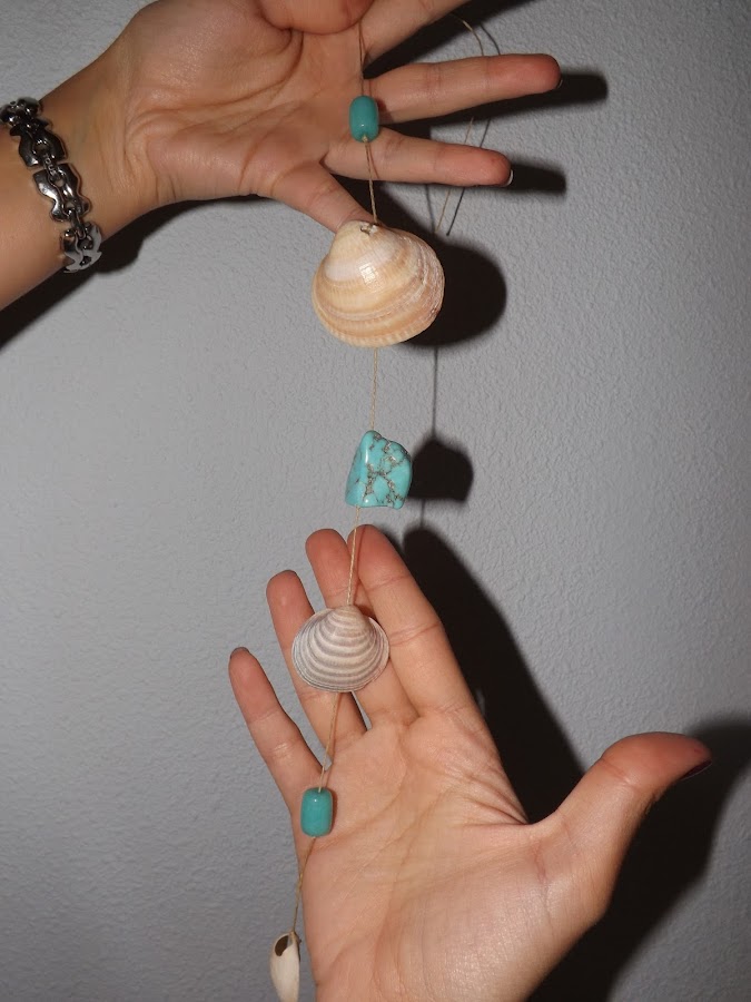 Podéis crear la composición que vosotras queráis, la mía fue ésta. Intercalando conchas y abalorios en cinco filas y siendo la más larga la de enmedio.