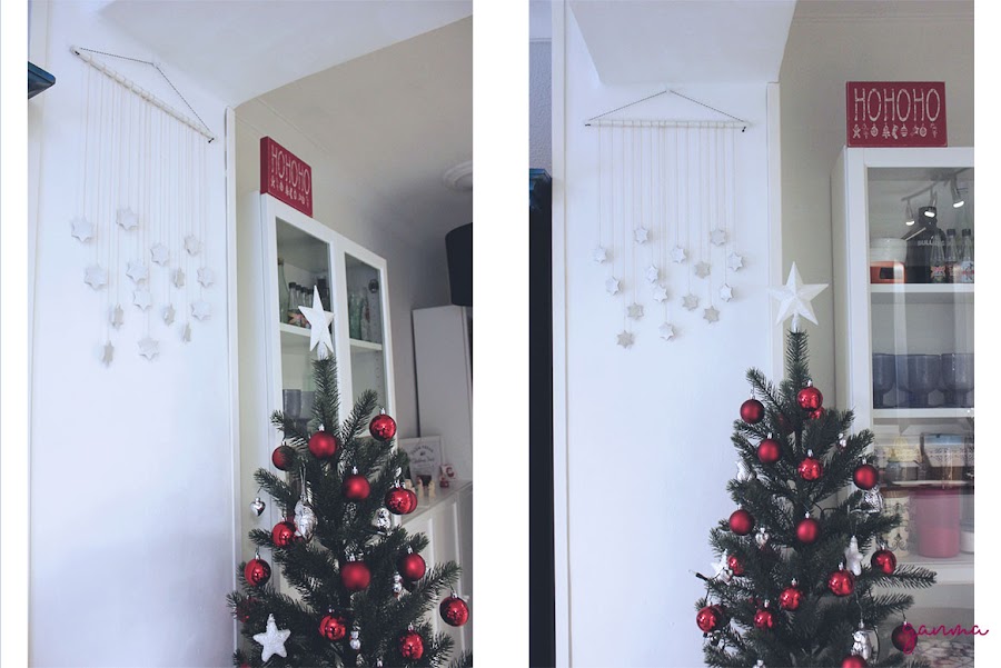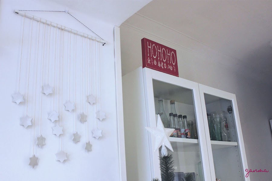 Con todo eso seco y listo, pasamos a cortar pedacitos de cuerda para colgar las estrellas. Con la pistola de pegamento pegamos una punta a la estrella y la otra la atamos a nuestro palo. A mi me gusta que cada estrella quede a una altura distinta pero puedes colocarlas como mas te guste.