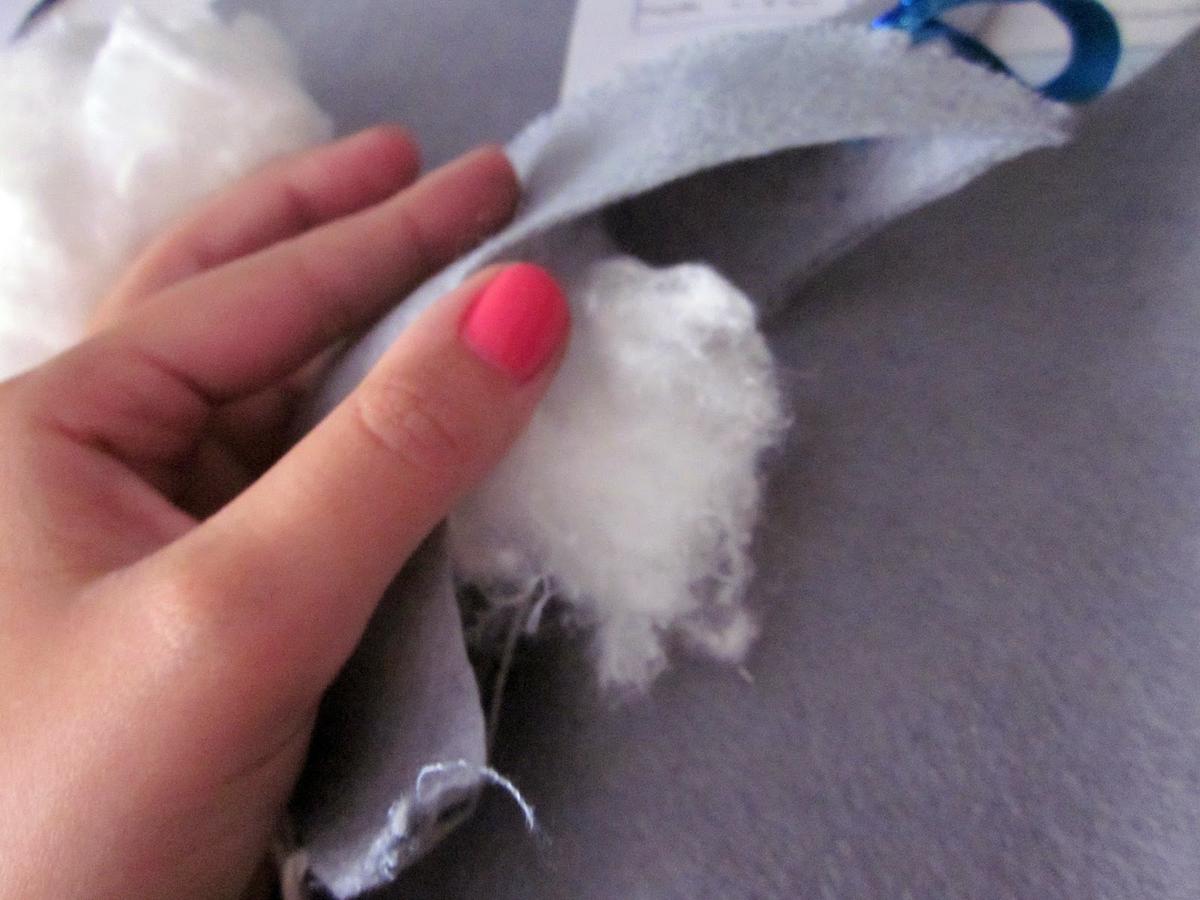 Tanto con la luna como con las estrellas, cosí toda la forma dejando huecos para rellenarlas. En la parte inferior de la luna, antes de cerrar ese hueco, cosí tres trozos de cuerda de diferente longitud para que de ellos colgaran las estrellas. Los extremos los introduje en las estrellas y realicé el mismo procedimiento que con la luna. En la parte superior de la luna, cosí también un trozo de lazo turquesa, de igual manera que las cuerdas, pero esta vez no dejé ningún extremo fuera, sino que los uní ambos y quedaron cosidos por el interior de la luna.