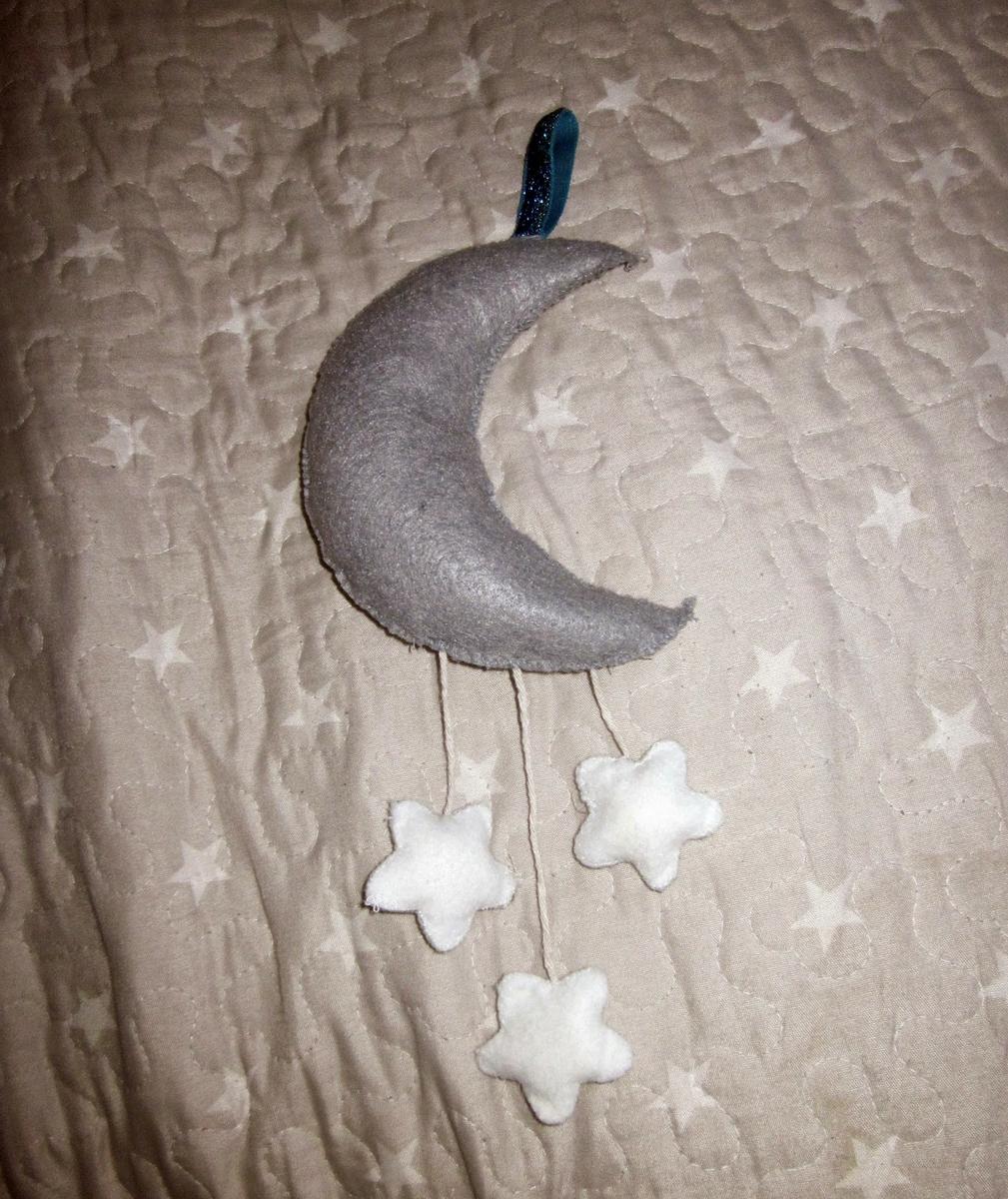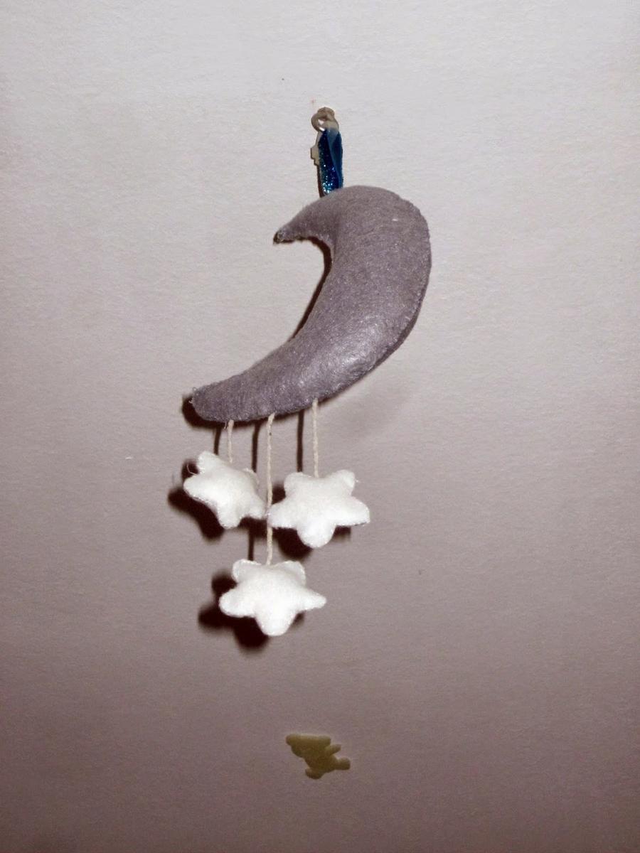 Como véis, el móvil lo conforman un lazo turquesa para colgarlo del techo, una luna grande de la que cuelgan tres lazos de diferente longitud que terminan en tres estrellas de igual tamaño.