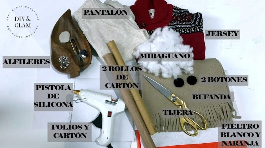 Menos el fieltro blanco y naranja que los he comprado, el resto de elementos los tenía en casa. Incluso el miraguano (relleno sintético de cojín) lo he reutilizado de un cojín viejo que tenía guardado.