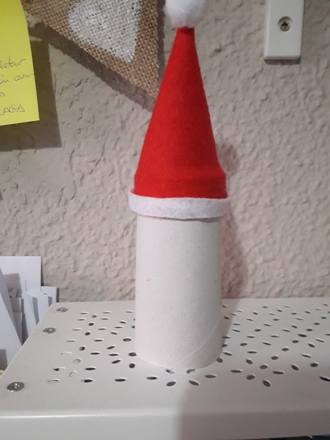 A este gorro le añadimos un pompón blanco en el extremo de arriba y se lo ponemos al rollo de cartón: