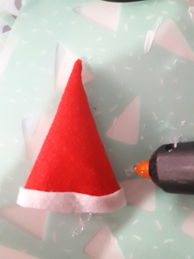 En esta ocasión lo más complicado es el gorro de Papá Noel. Para ello, elaboraremos una especie de cono con fieltro rojo y en el borde pegaremos con cola blanca una cinta de fieltro blanco: