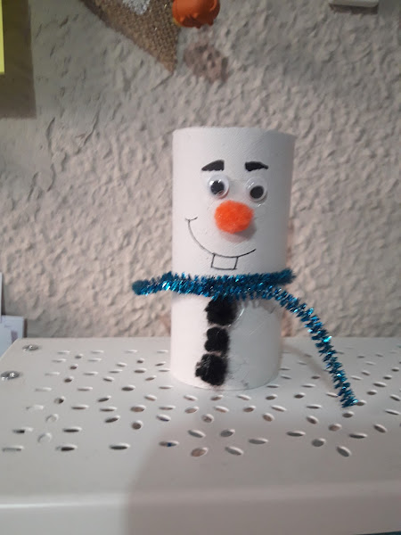 Tan solo tenemos que añadir los ojitos al cartón, poner un pompón naranja a modo de nariz y dibujar con rotulador negro las cejas y la boca como las tiene Olaf. También añadimos en la parte inferior tres pompones negros a modo de botones y, si queréis, una bufanda. Yo la puse con alambre forrado de colores que venden en los bazares. También podéis ponerla con fieltro.