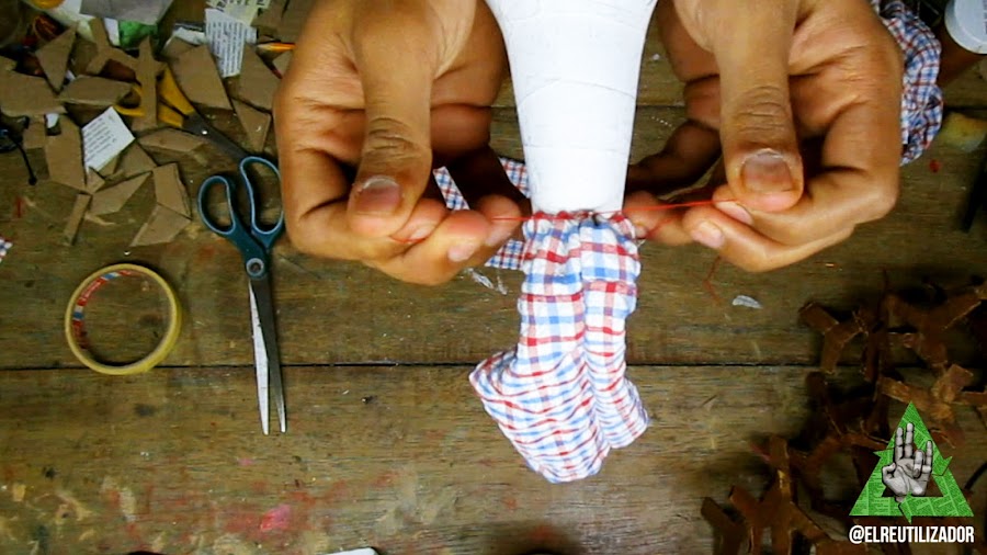 Paso #8.3: Introducimos por la base del cilindro la punta del pico de nuestra botella, jalamos los dos fragmentos de hilo que dejamos en la costura y los amarramos tratando de que quede lo más seguro posible.