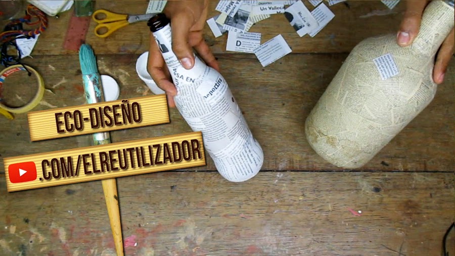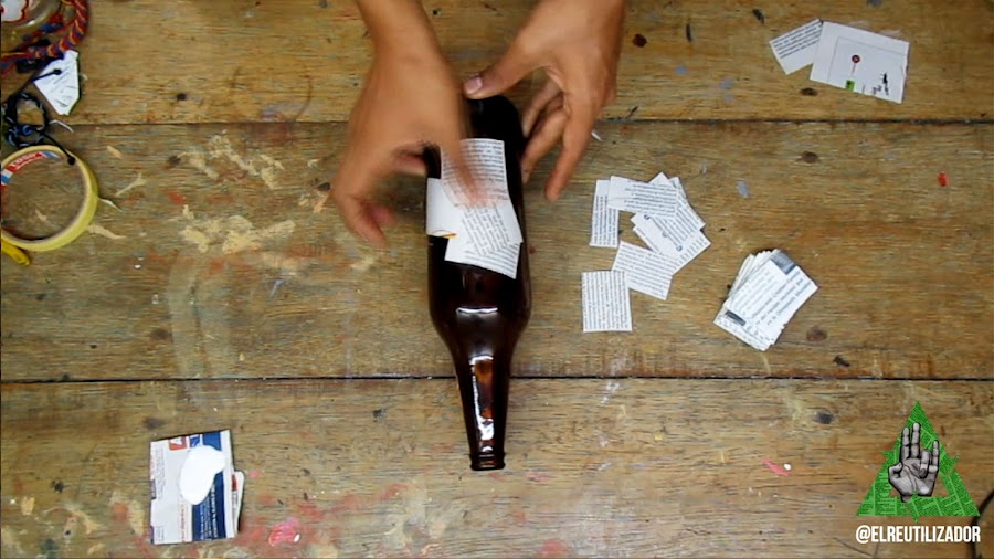 Paso #2: Esparcimos una capa delgada de pegamento blanco sobre nuestros cuadros de periódico y tapizamos con ellos las botellas.