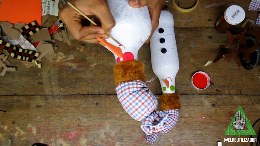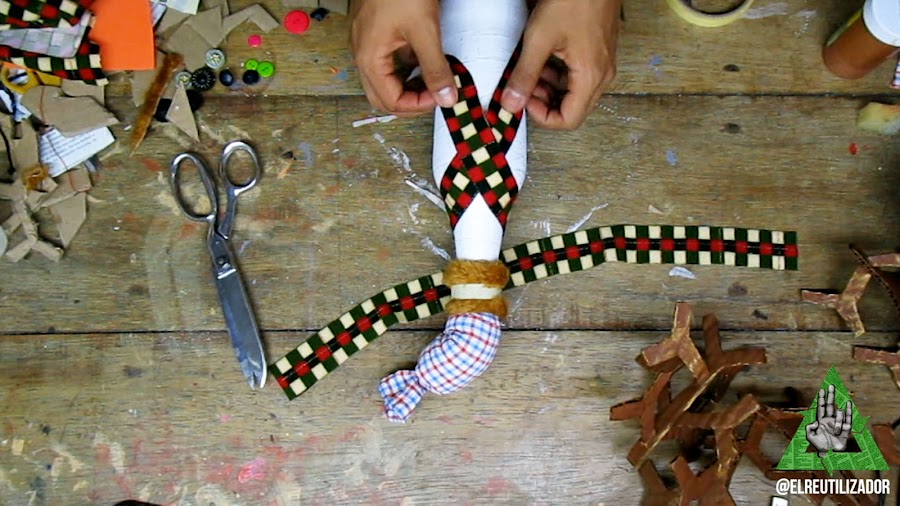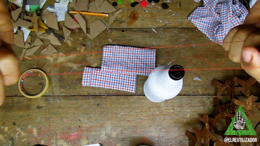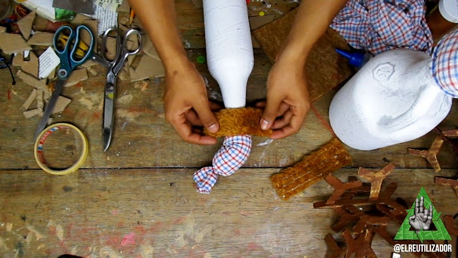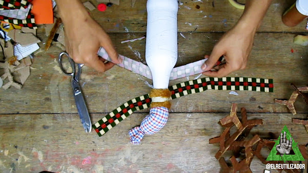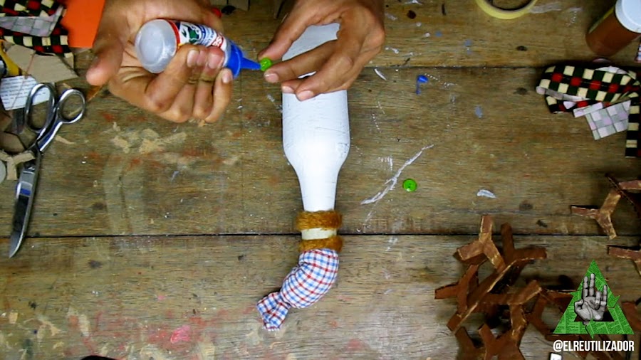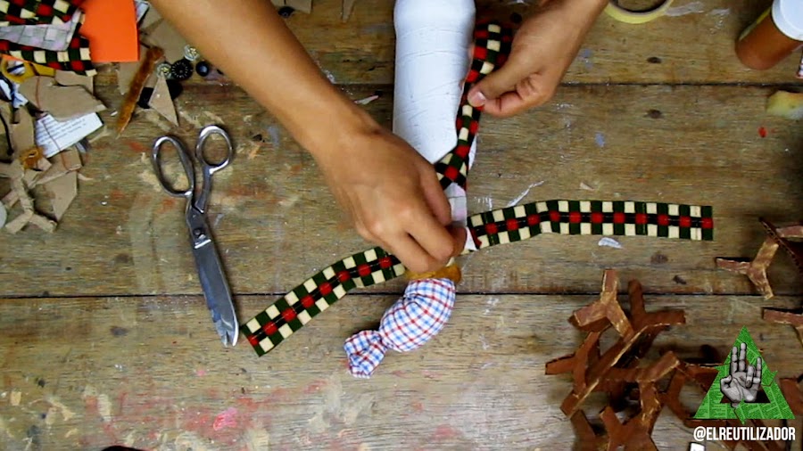 Paso #12: Para las bufandas, vamos a tomar retazos de patrón diferente al retazo de los gorros, lo podemos cortar con las dimensiones que queramos y los anudamos al cuello de las botellas.