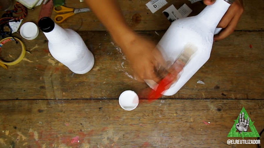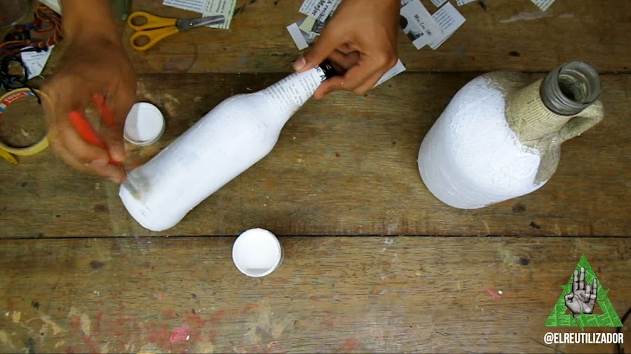 Paso #3: Ahora, cubrimos con una capa gruesa de pintura blanca la superficie tapizada con periódico de nuestras botellas, esperamos a que la capa seque y le damos una nueva. Si después de seca esta segunda aplicación de pintura es necesario una tercera, para que la tinta del papel quede cubierta por completo, aplicarla.