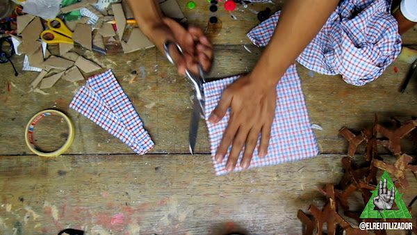 Paso #8.1: Es hora de hacer los gorros de nuestros amigos, tomamos retazos de tela del color o el patrón que más nos guste y los cortamos de forma rectangular (Dejando el lado más corto del rectángulo dos veces más largo que la circunferencia de los picos de nuestras botellas).