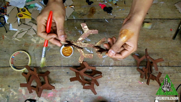 Paso #7.1: Después de seca la pintura marrón, tomamos una brocha de cerdas despeinadas y con un poco de pintura color ORO resaltaremos el contorno del cartón.