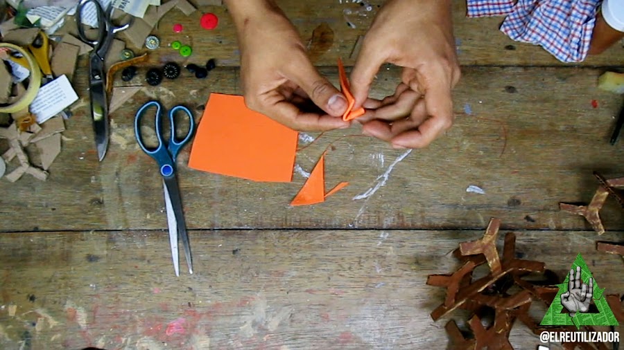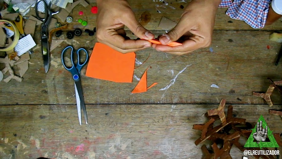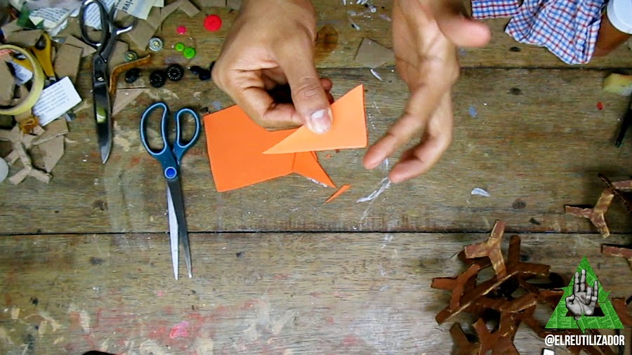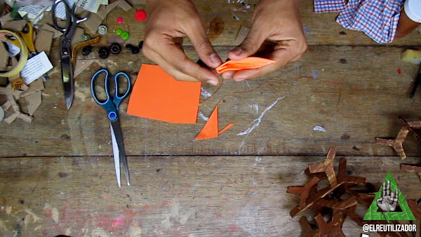 Paso #11: Para la nariz, vamos a cortar triángulos rectángulos (Triángulos con un ángulo recto) de Foamy (Etilvinilacetato: Goma EVA, EVA foam, espumoso o espumeta.). Esparcimos sobre uno de sus lados cualquier tipo de pegamento y doblamos a la mitad para sellar la forma (Si doblamos a la mitad los triángulos, veremos que hay una punta sobresaliendo, la punta deberá quedar en el interior de la parte doblada).