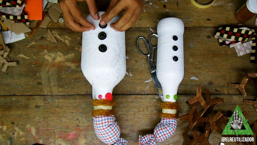 Paso #13: Ahora vamos a ponerle ojos a nuestro personajes. Yo utilicé dos botones de tamaños diferentes (Los tamaños varían dependiendo el volumen de la botella), adicional a los ojos, vamos a poner tres o cuatro botones en frente, en el centro de los cuerpos de nuestras botellas.
