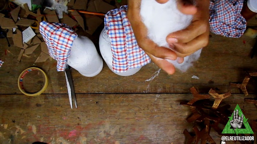Paso #9: Vamos a tomar un puñado de algodón o algodón sintético, rellenamos con este el interior de los gorros, luego, con un trozo de hilo vamos a amarrar y cerrar las bolsas de tela, para finalizar, crearemos un pellizco uniendo con una puntada, los dos extremos de un lado del gorro.