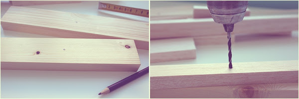 Con ayuda de un taladro, agujerearemos en el centro la pieza más grande y una de las de 25 centímetros, atravesando ambas maderas de un extremo a otro. También agujerearemos en el centro el listón de 18 centímetros de largo, pero esta vez hasta la mitad.