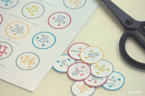 Una vez tengamos los sobres con sus sorpresas preparados, tendremos que numerarlos. En mi caso he usado las etiquetas de esta web, las he recortado y las he pegado en los sobres y cajitas de mi calendario.