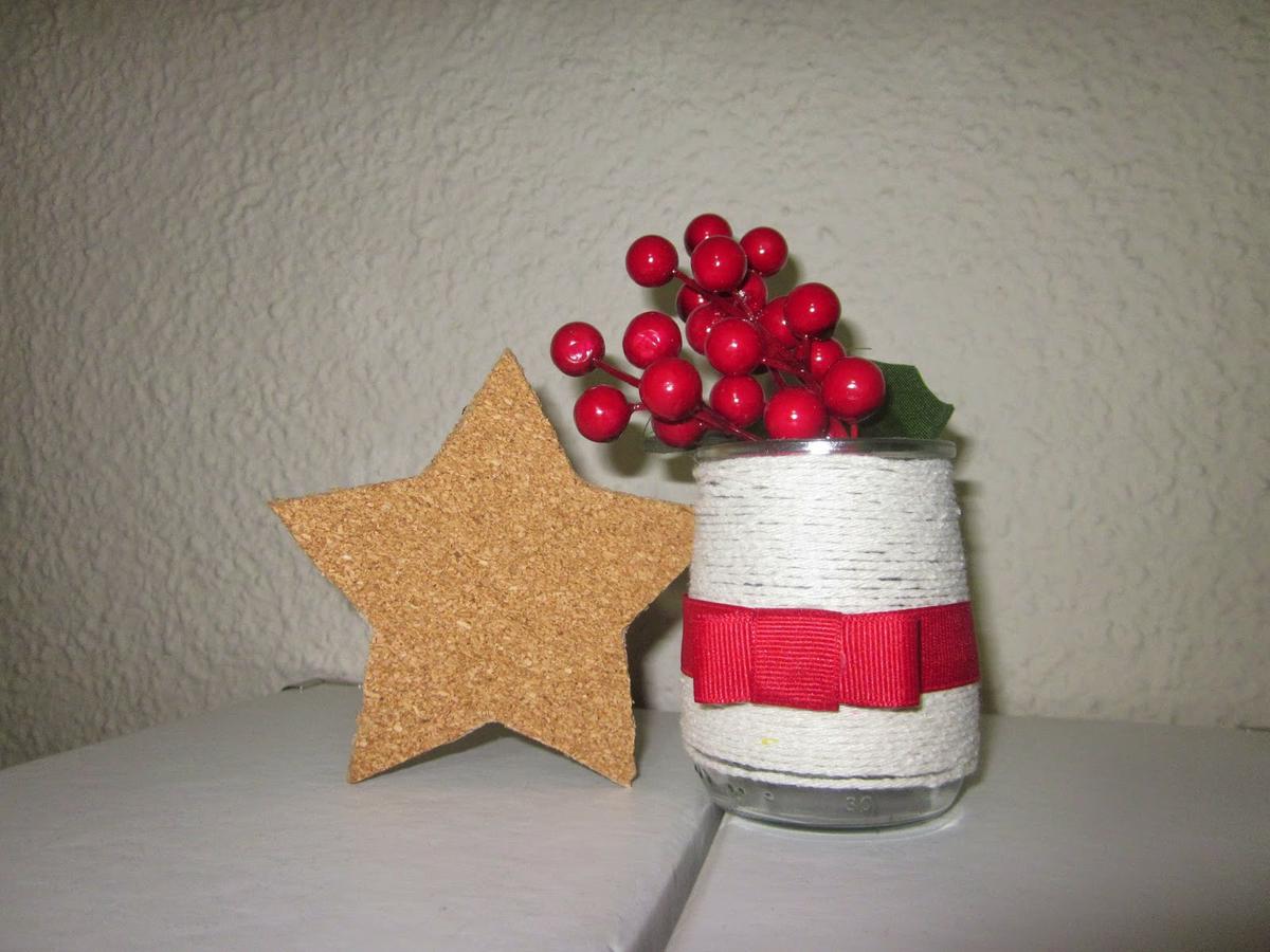 Para darle un toque navideño, hice otro posavasos un poco más pequeño y lo apoyé en este tarro de cristal (también DIY) para que lo complementara como adorno.