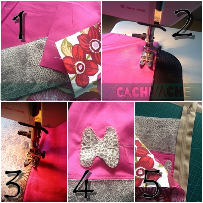 6-Después el turno para la cremallera: Colocar lado derecho de la tela con el lado derecho de la cremallera, centrándola. Ubicar también el derecho del forro y pasar un pespunte. Girar y pasar después una costura.