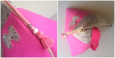 8-Dar otra vez la vuelta y pasar un pespunte colocando un lado de la cremallera unido con el centro del otro lado, creando así la forma de triangulo. En el lado donde está el cierre de la cremallera coloqué una cinta a modo de asa... pero se le puede poner una cadena o no poner nada.