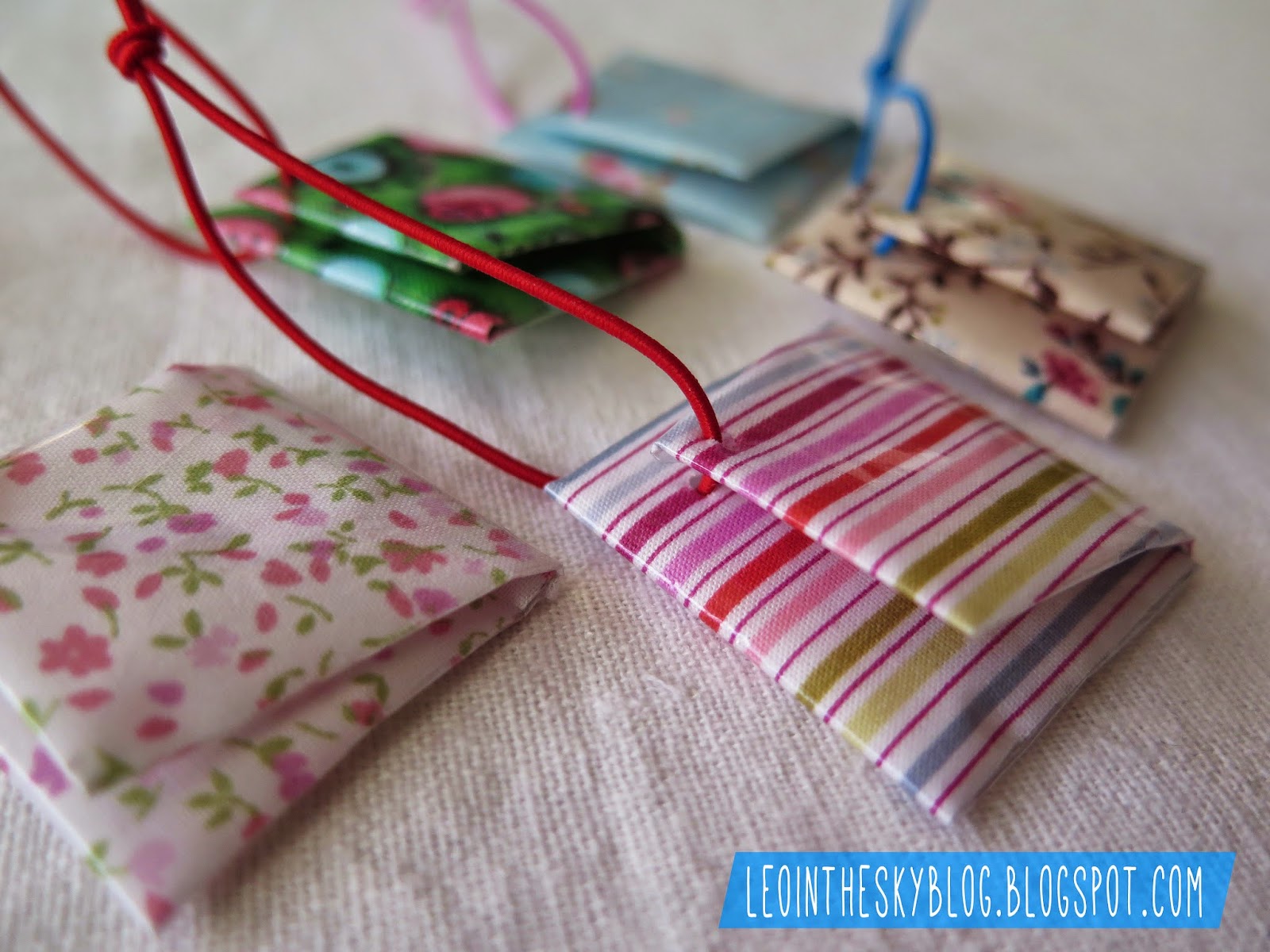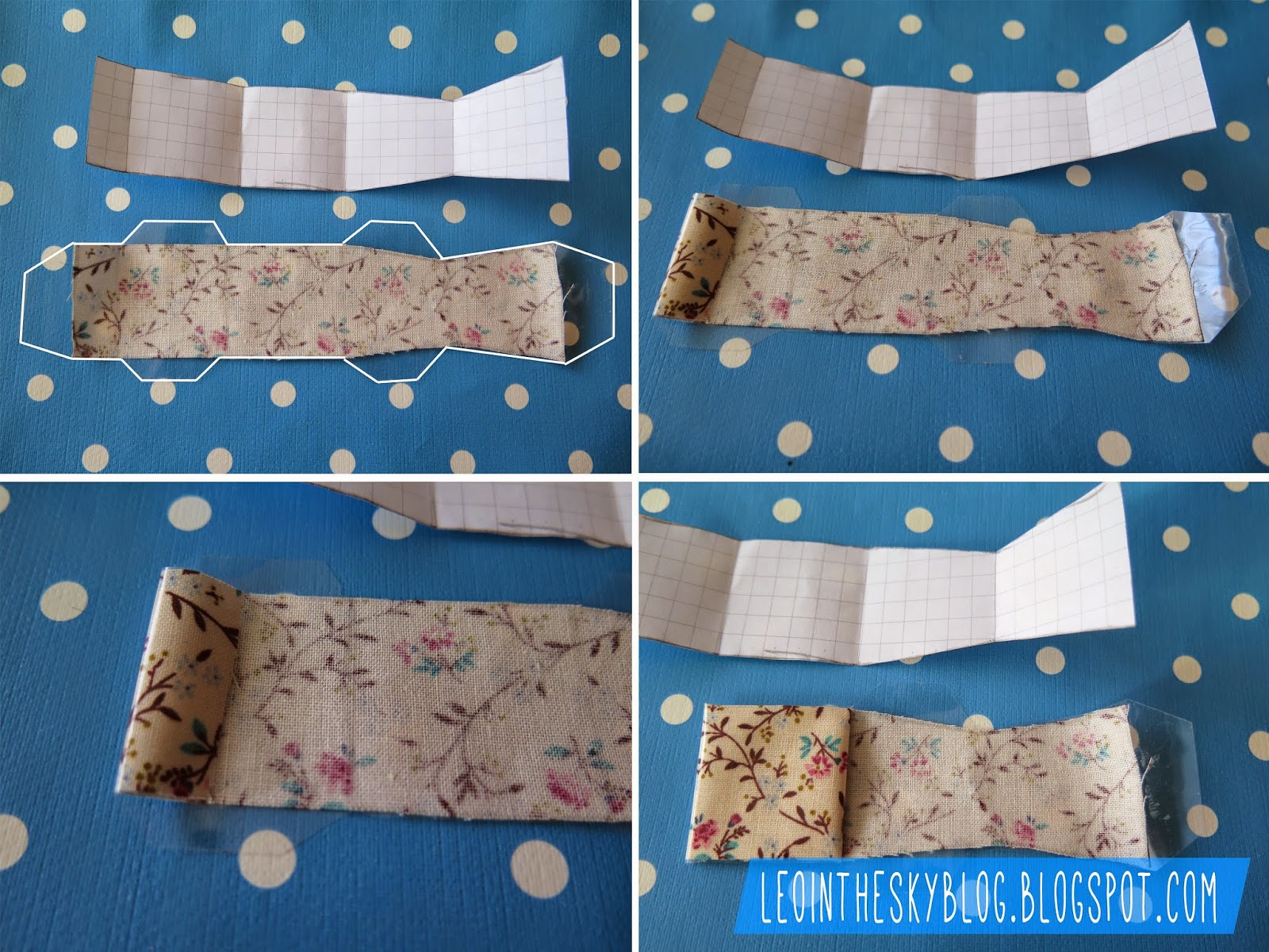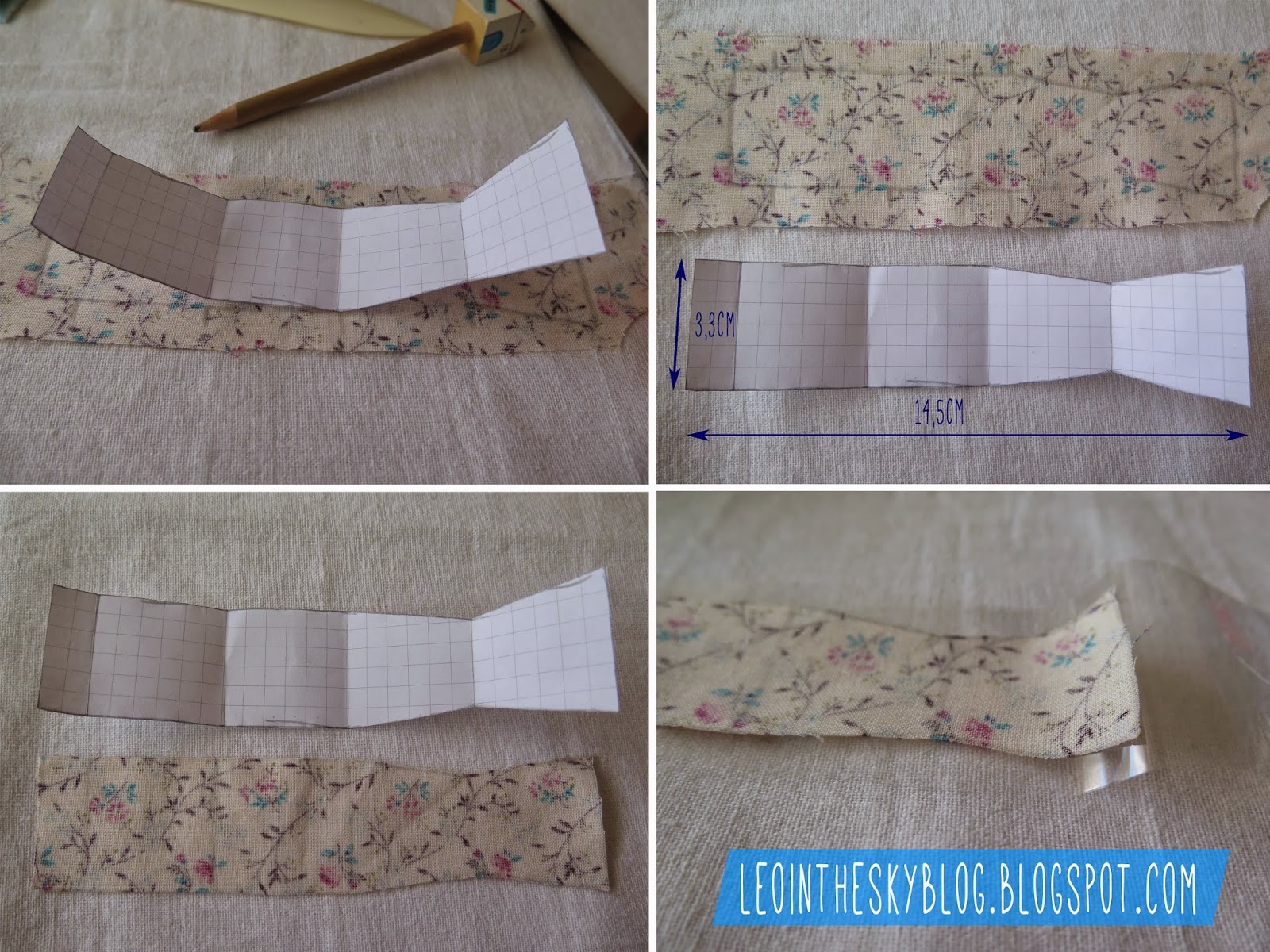 Materiales: retales de tela, tijeras, lápiz, papel de cuadritos para el patrón, cordón de goma finito, máquina para hacer agujeros y cinta de embalar transparente.