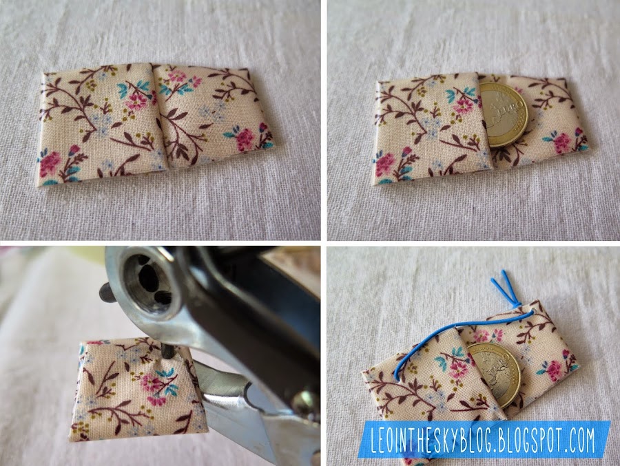 Ahora metemos la moneda, doblamos la solapa y hacemos un agujero en la esquina, teniendo cuidado de atravesar toda la bolsita.